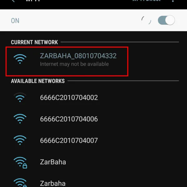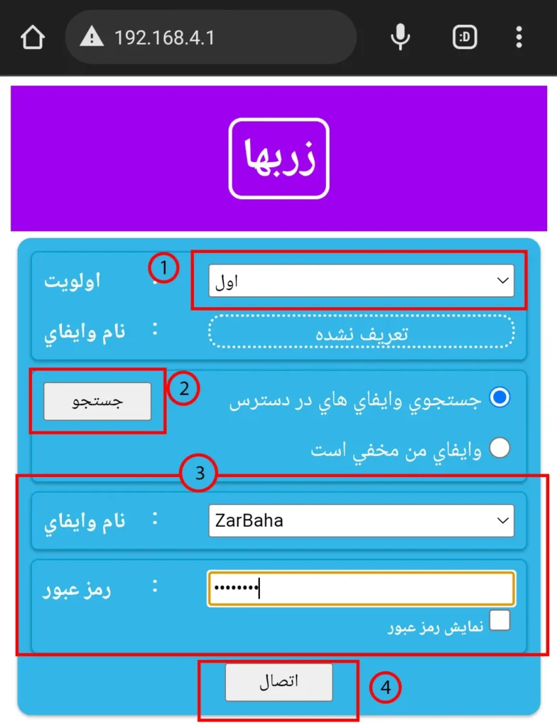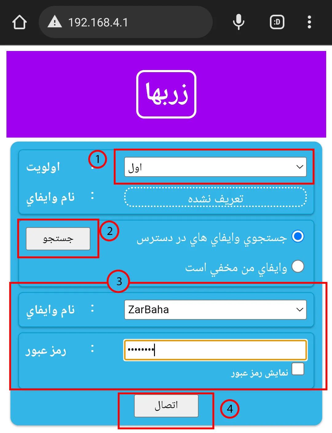 دستگاه را روشن کنید. سپس در لیست وایفایهای گوشی اندرویدی خود، به وایفایی که نام آن متشکل از عبارت zarbaha و سریال درج شده در زیر تابلوی شماست، متصل شوید. تا صفحه “زربها ” باز شود.