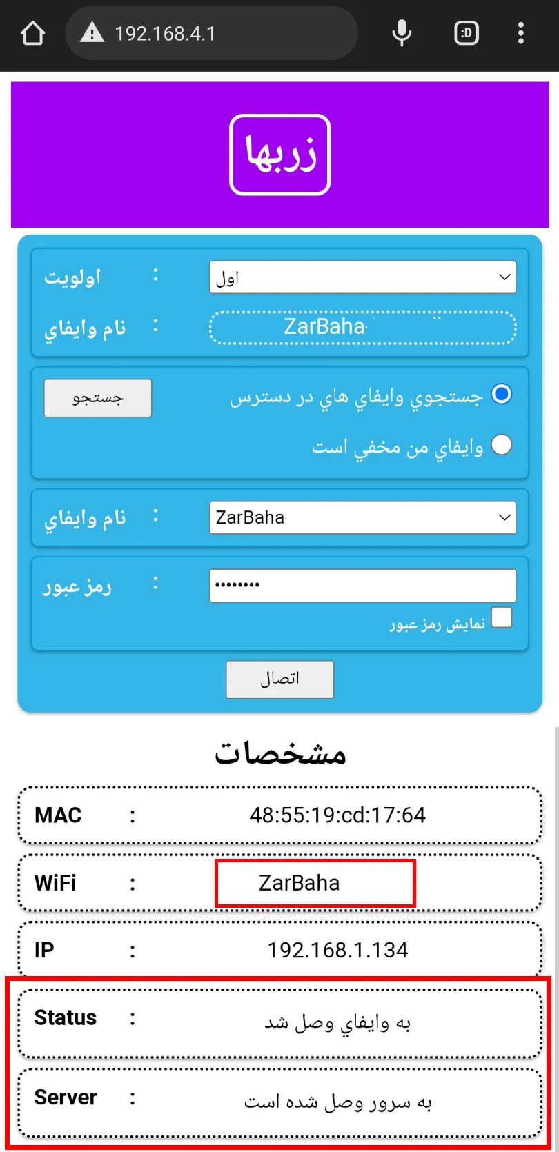 در کادر «مشخصات»، در قسمت Wi-Fi، نام مودم (یا نقطه اتصال گوشی) شما نوشته میشود. سپس در کادر Status در صورت درست وارد کردن رمز وایفای، عبارت «به وایفای وصل شد» درج میشود و کمی بعد عبارت «به سرور وصل است» در قسمت Server نشان داده میشود. نشانه اتصال تابلو شما به مودم مغازه، روشن شدن LED زرد رنگ و نشانه اتصال تابلو شما به سرور، روشن ماندن LED سبز میباشد.